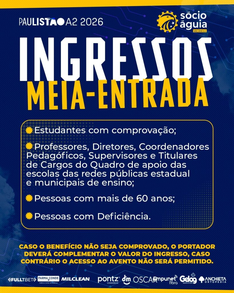 Os ingressos para o jogo já estão à venda pela plataforma saojose.soudaliga.com.br, nas Lojas Oscar e na Loja da Águia.