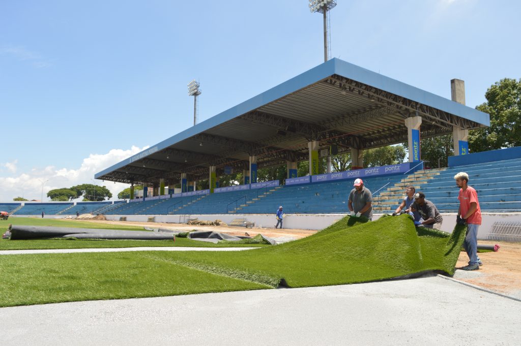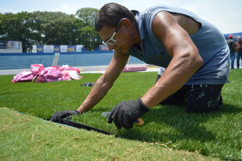 Ao todo são mais de 3 mil metros de tapetes. E todo o trabalho está sendo realizado pela empresa IPC Supply Gramas Sintéticas, de São José dos Campos. O modelo é homologado pela Fifa e o mesmo utilizado no Centro de Treinamento do Cuiabá Esporte Clube, da série B do Brasileirão.