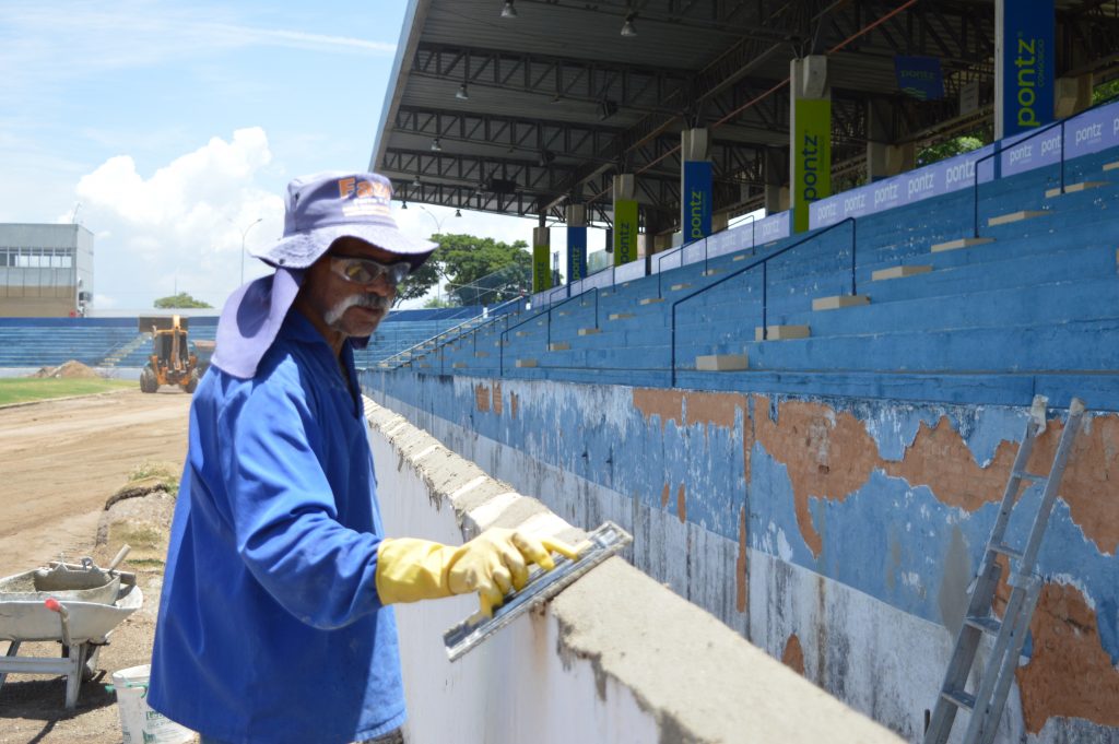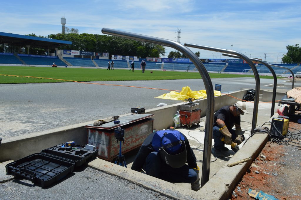 Grades – Todas as grades do tipo “lanças” já foram removidas do entorno do fosso do estádio. As equipes estão trabalhando no acabamento para partir para a etapa de pintura na próxima semana.