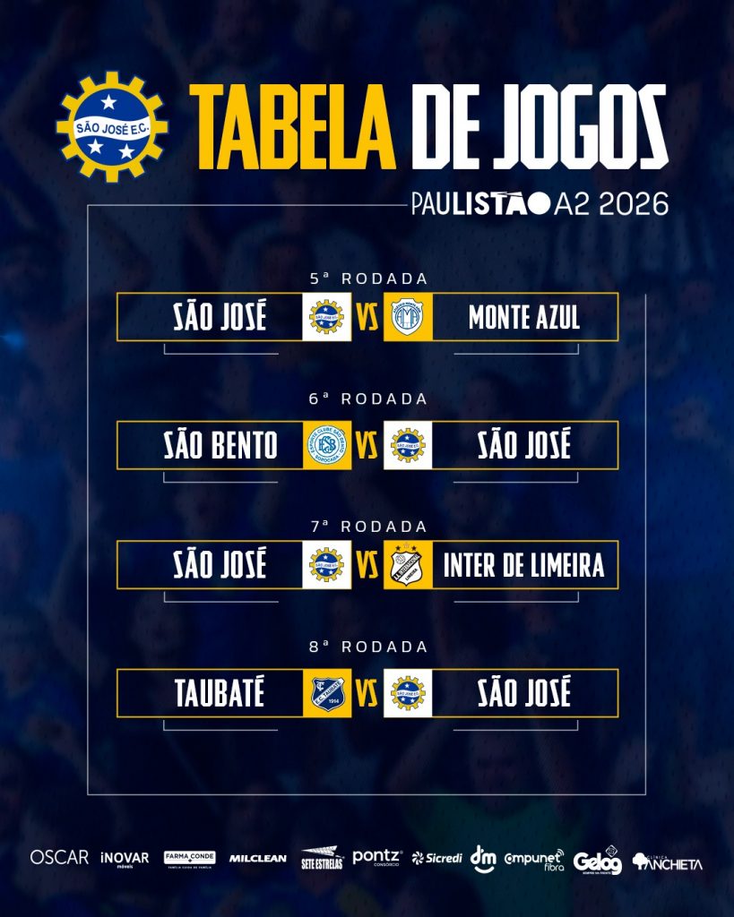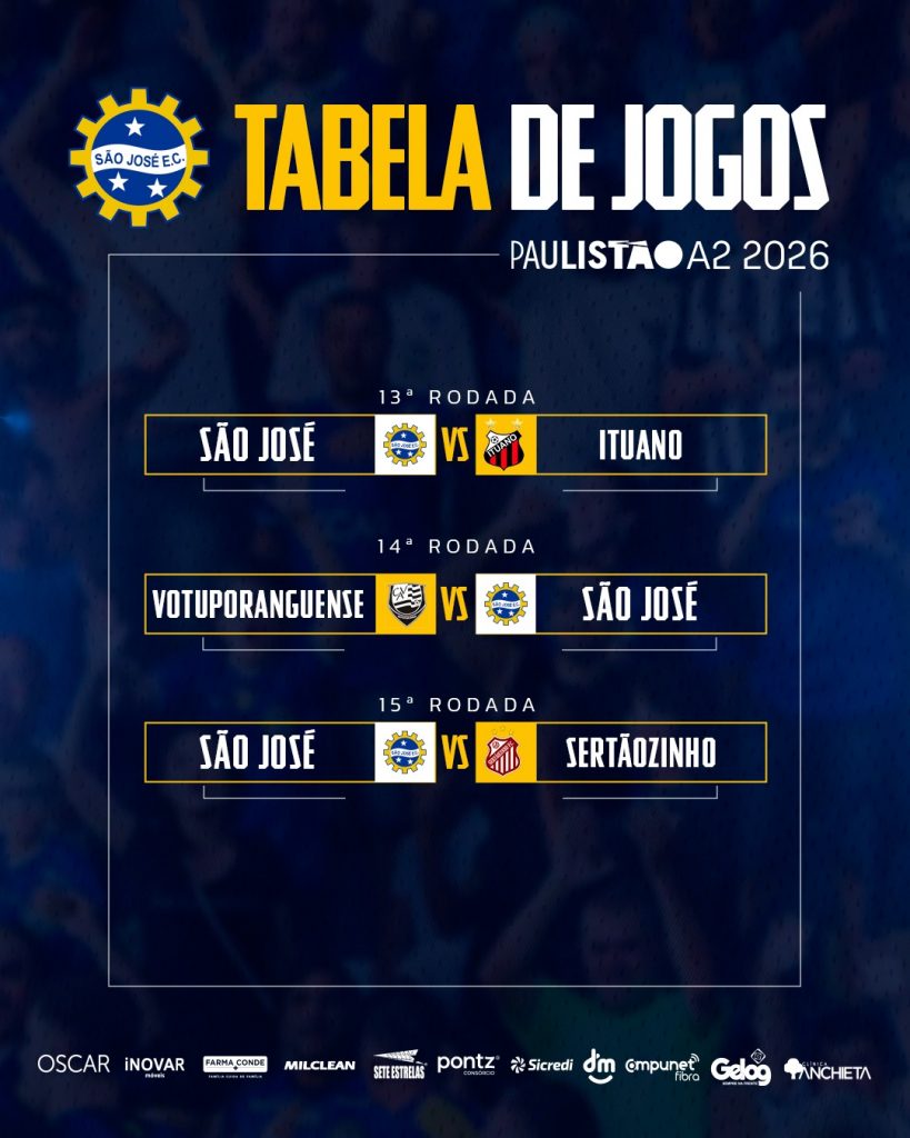 A Federação Paulista de Futebol divulgou no início da noite desta quinta-feira (27) a tabela básica do Campeonato Paulista da série A2 de 2026. Na estreia, o São José vai até a cidade de Lins encarar o Linense. Na sequencia, a Águia do Vale fará dois jogos no “Monumental” Martins Pereira, contra o Grêmio Prudente e o Juventus.