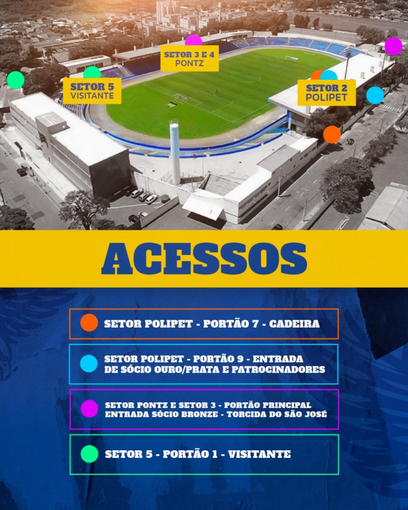 - Setor Visitante: Portão 1 – Rua Ana Gonçalves da Cunha (ao lado da escola Ronconi)