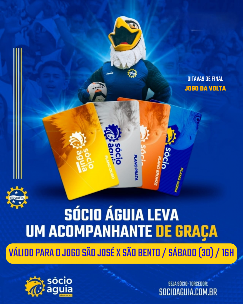 Os Sócios Águia (ouro, prata e bronze) com planos ativos e mensalidade em dia, poderão levar um acompanhante gratuitamente no setor que o seu plano é destinado! Basta o acompanhante vestir a camisa da Águia e entrar junto com o sócio para viver a experiência de torcer pelo São José.